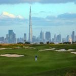 Op de achtergrond prijkt de skyline van Dubai. Het clubhuis van Dubai Creek Golf springt het meest in het oog, het gebouw is geïnspireerd op de zeilen van een Arabische zeilboot.