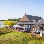 Het rieten dak met zijn koperen rand is al van verre te zien en past schitterend in zijn omgeving. Vanaf overdekte, beschutte terrassen, waar u zich in de avondzon kunt warmen aan het vuur van de open haard, heeft u prachtig uitzicht op de grote vijver en de golfbanen.