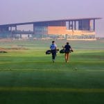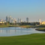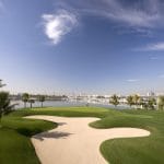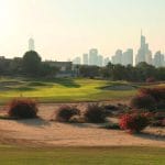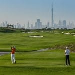 Op de achtergrond prijkt de skyline van Dubai. Het clubhuis van Dubai Creek Golf springt het meest in het oog, het gebouw is geïnspireerd op de zeilen van een Arabische zeilboot.