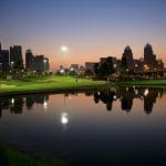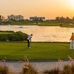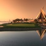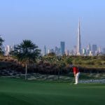 Op de achtergrond prijkt de skyline van Dubai. Het clubhuis van Dubai Creek Golf springt het meest in het oog, het gebouw is geïnspireerd op de zeilen van een Arabische zeilboot.