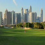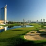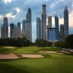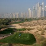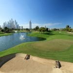 Op de achtergrond prijkt de skyline van Dubai. Het clubhuis van Dubai Creek Golf springt het meest in het oog, het gebouw is geïnspireerd op de zeilen van een Arabische zeilboot.