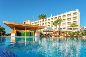 Moderne Rooftop AP CABANAS Pool Bar & Lounge met een prachtig uitzicht over de Ria Formosa en de Atlantische Oceaan.